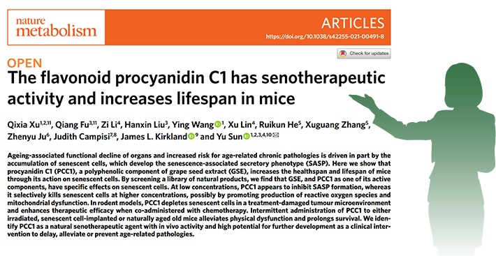 [5]Xu Q , Fu Q , Li Z ,et al.The flavonoid procyanidin C1 has senotherapeutic activity and increases lifespan in mice [J].Nature Metabolism, 2021.